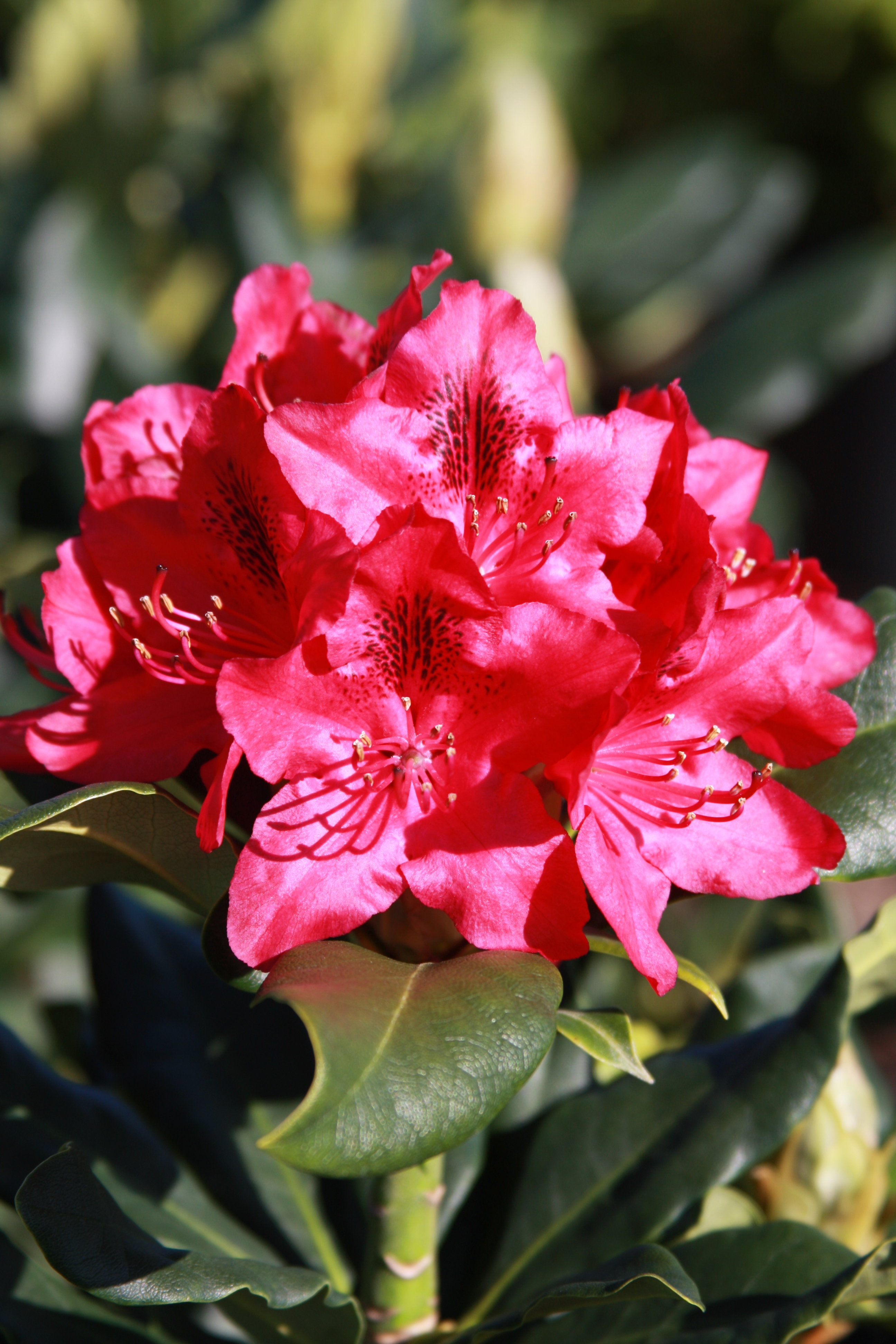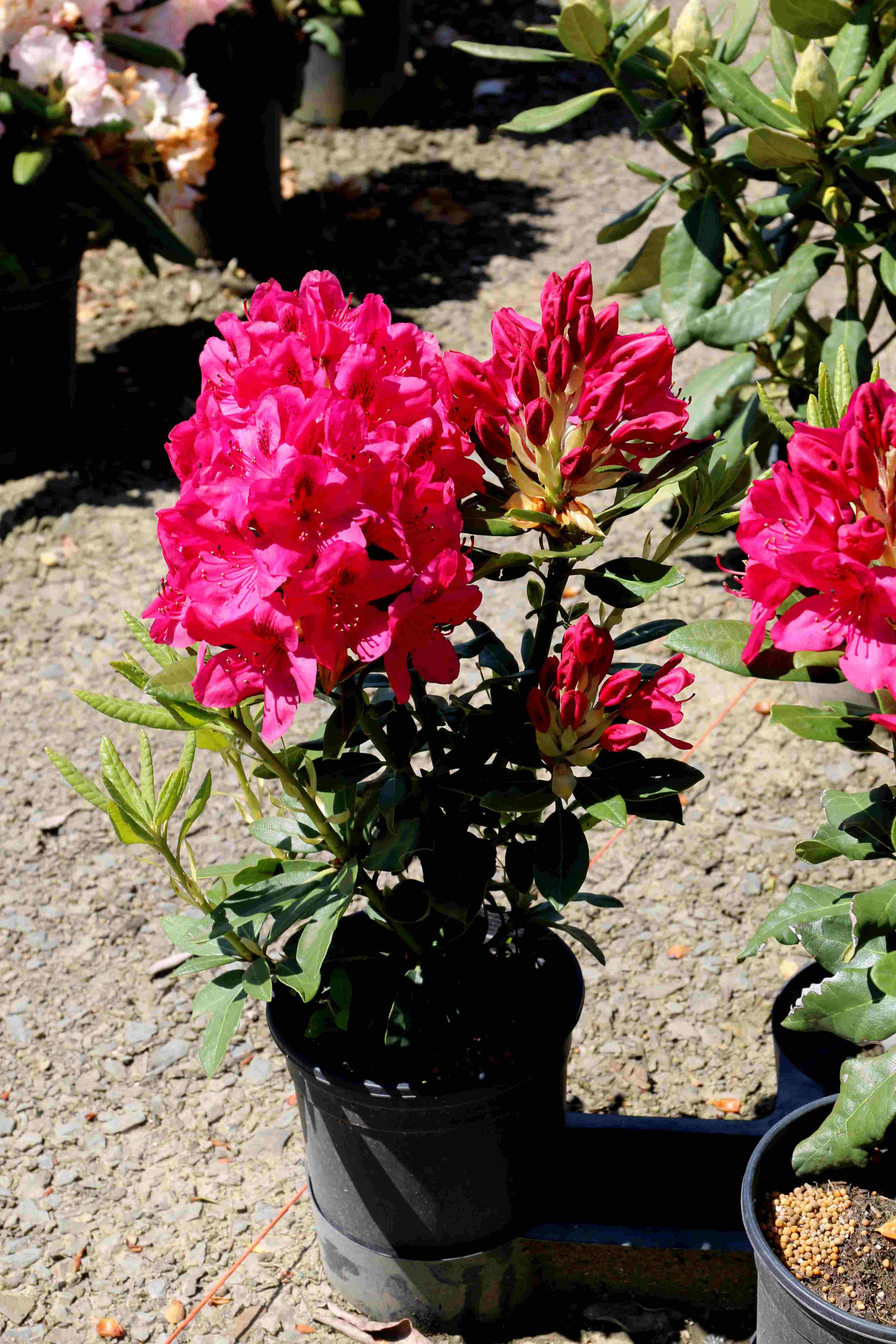 A fast growing, upright shrub. The trusses are red with lavender undertones and a darker blotch. The flowers appear in mid-season. It has glossy green leaves with a twisted edge. One of the more sun tolerant rhododendrons. H-1. It prefers partial shade to full sun, and moist, cool, acidic well-drained organic soil. Removal of spent blossoms encourages new growth and future flowers.