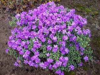 A dwarf form, with small, slightly aromatic blue-green leaves. The bright purple flowers appear in mid-season. Sun tolerant. Great in a rock garden, as an edging, or foundation planting. H-1. It prefers partial shade to full sun, and moist, cool, acidic well-drained organic soil. Removal of spent blossoms encourages new growth and future flowers.