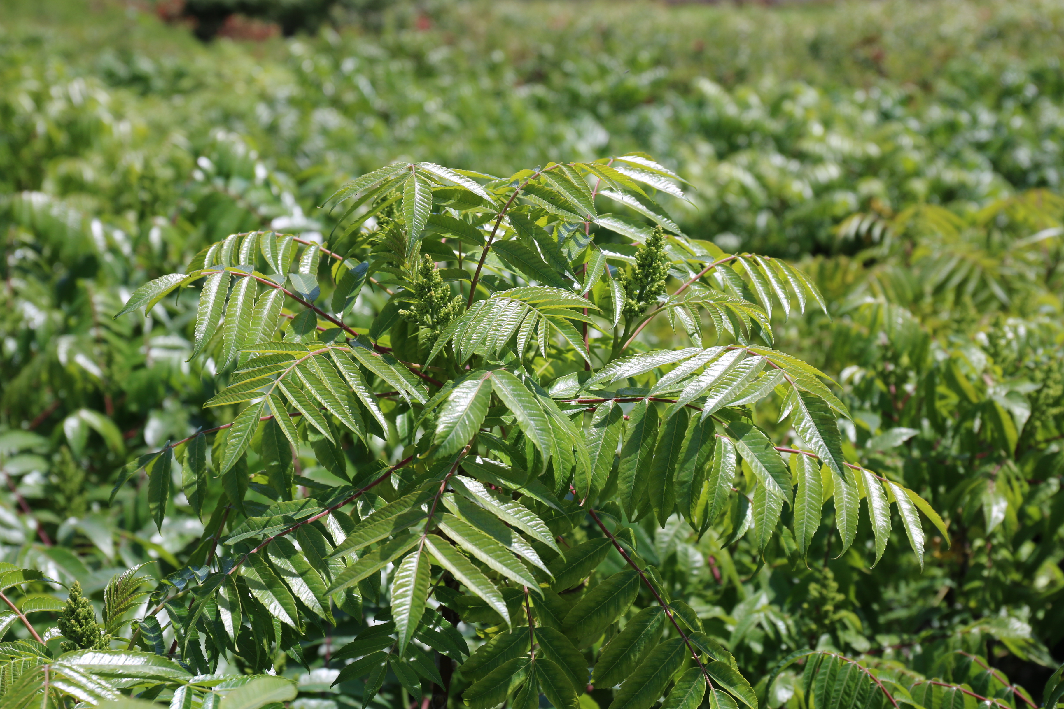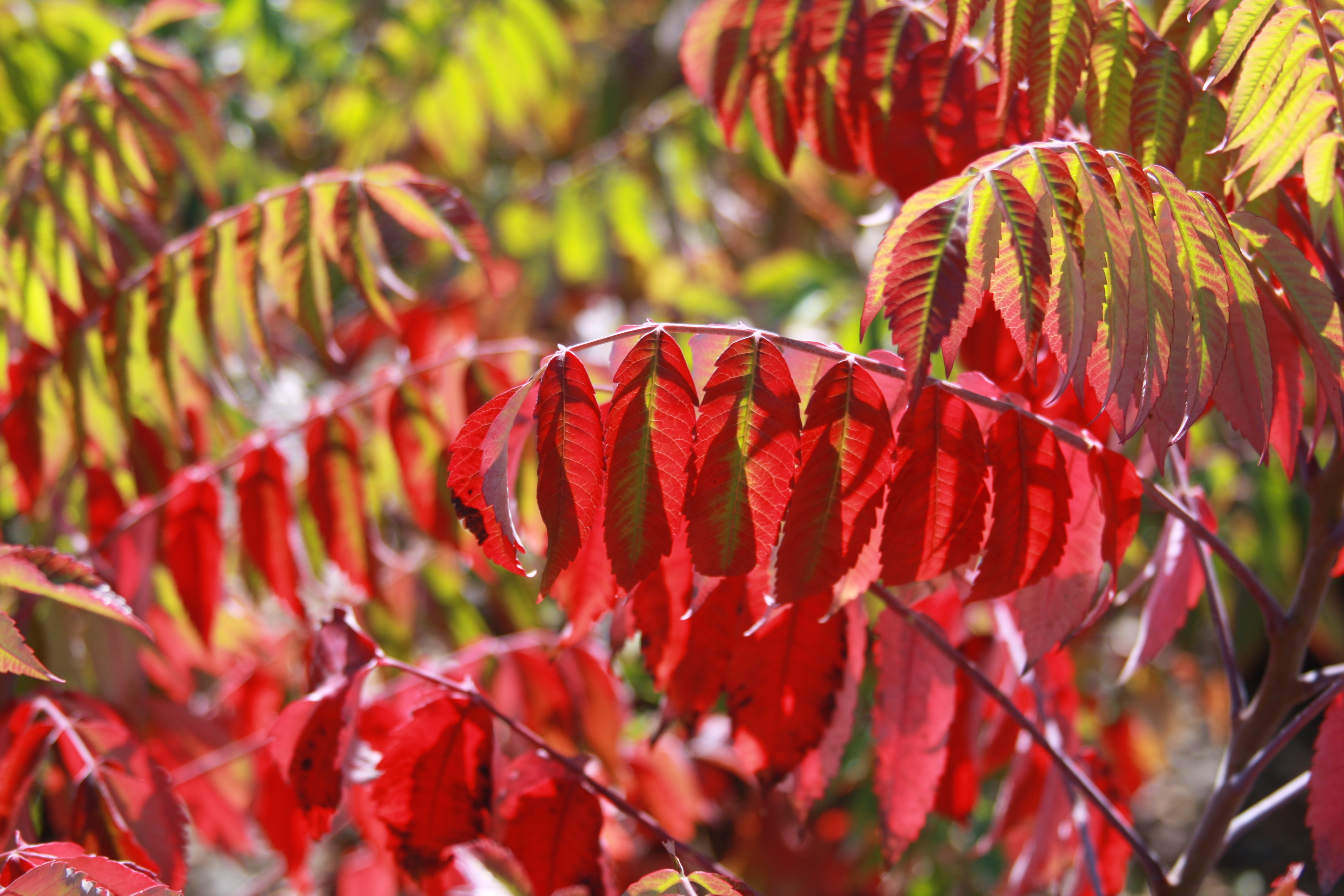 A large, suckering shrub with deep green foliage that turns brilliant red, orange, and purple in the fall. Yellow clusters of flowers develop into cones of scarlet fruit in the later summer. Very heat and drought tolerant. It prefers full sun to partial shade in a well-drained soil. It may be used for mass planting, to stabilize an embankment, or naturalized areas.