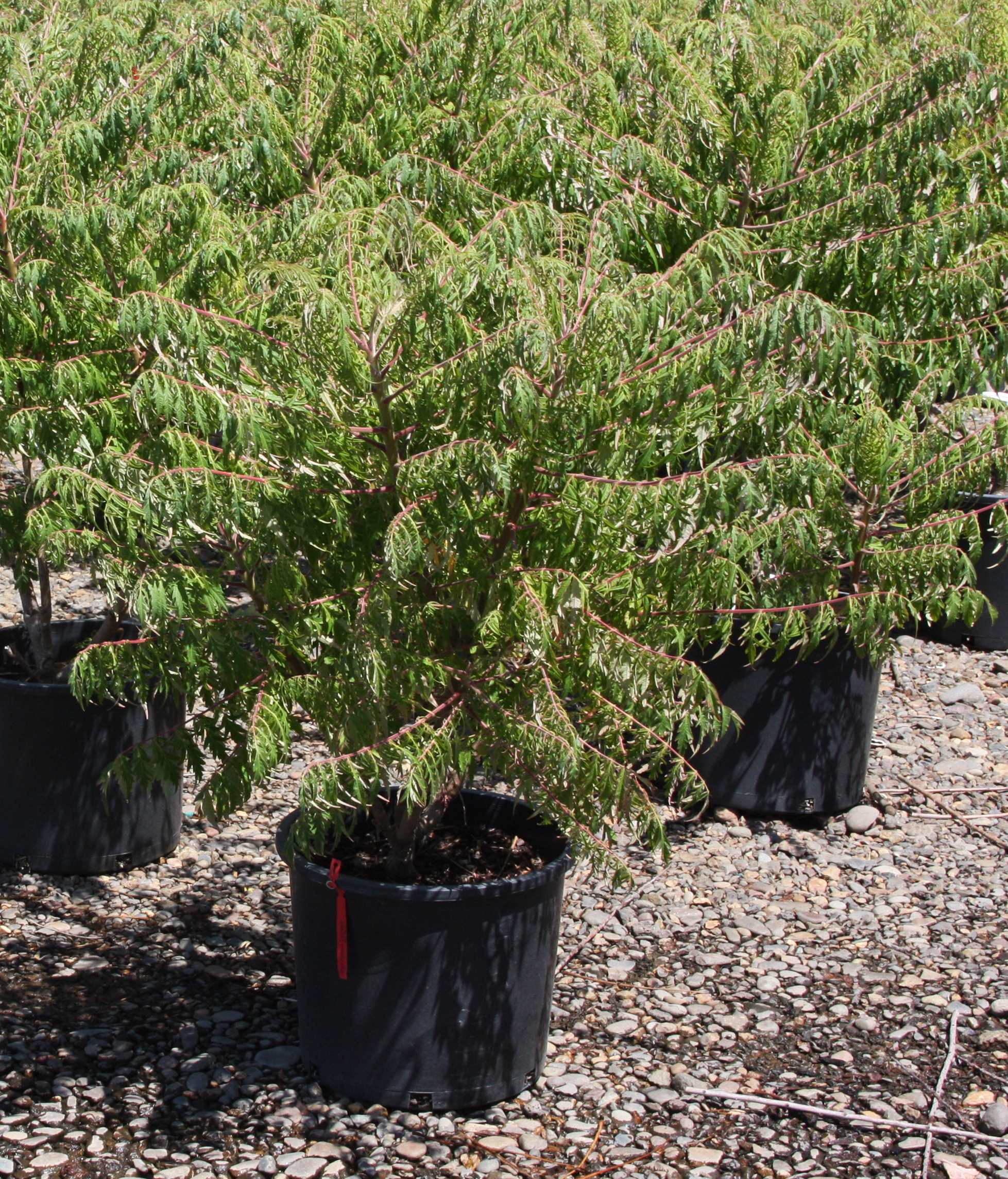 It is similar to the species except the leaves are deeply divided, creating a fine-textured ferny appearance in the summer. Yellow clusters of flowers are followed by fuzzy red cones of fruit in fall. It is very heat and drought tolerant. Fall color is bright red. It prefers full sun to part shade and a well-drained soil. Use for mass plantings or in naturalized plantings.