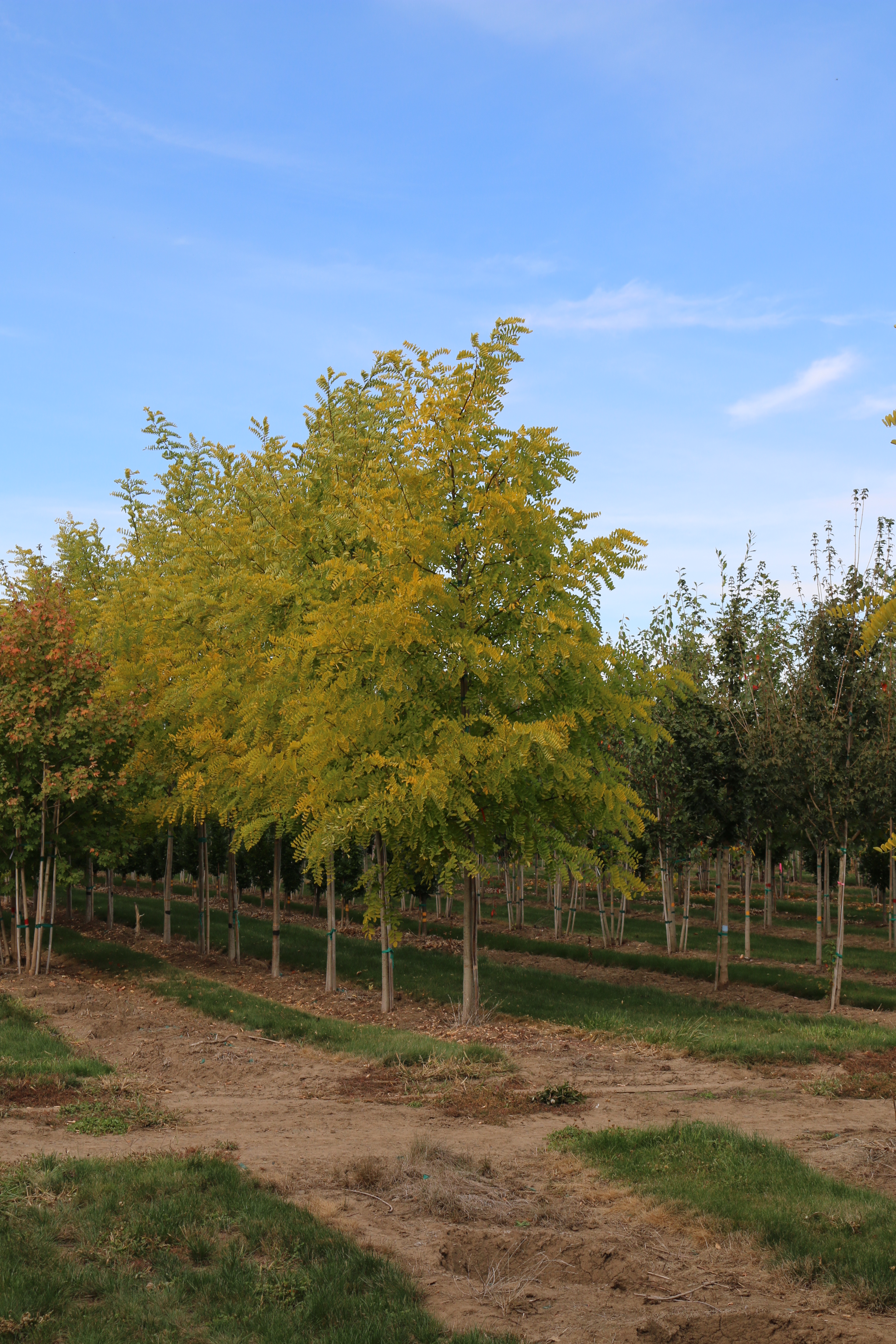 An oval, upright arching tree best known for its bright lemon-yellow summer color. In some shade, the color tends toward chartreuse. The late spring pea-like flowers are white and held in pendulous clusters. The foliage is pinnately compound, giving this fast growing tree a fine texture. The bark develops deep furrows with age. It grows well in urban conditions, and adapts well to heat and poor, dry soils.