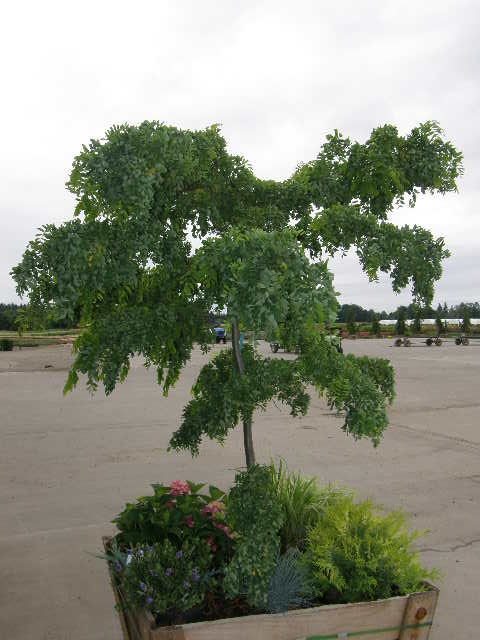 An irregularly spreading tree with twisted stems and leaves. Bees are attracted to the clusters of small, fragrant white flowers that appear in spring. Grown as a small tree or in a multi-stem form. The foliage is green in summer, with yellow fall color. Very interesting and quite ornamental especially when dormant. It grows well in hot dry climates, adapting well to urban environments and poor soils. PP 9,771.
