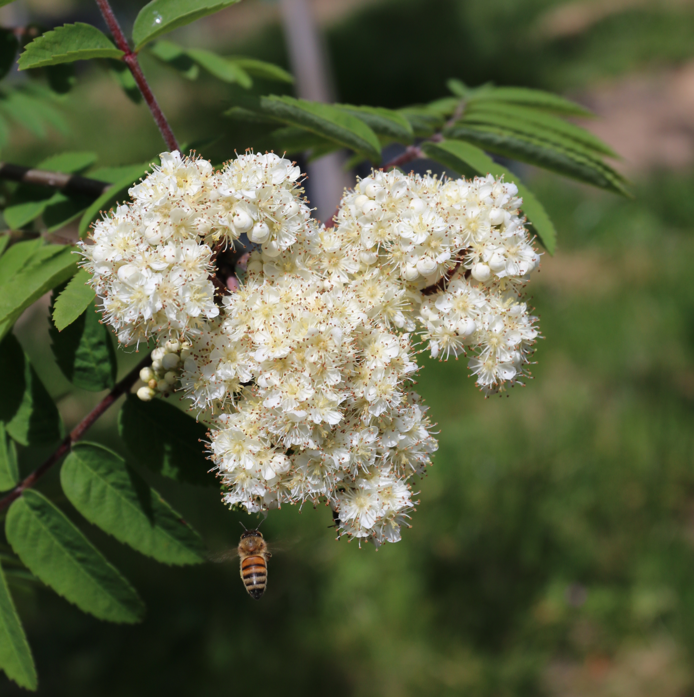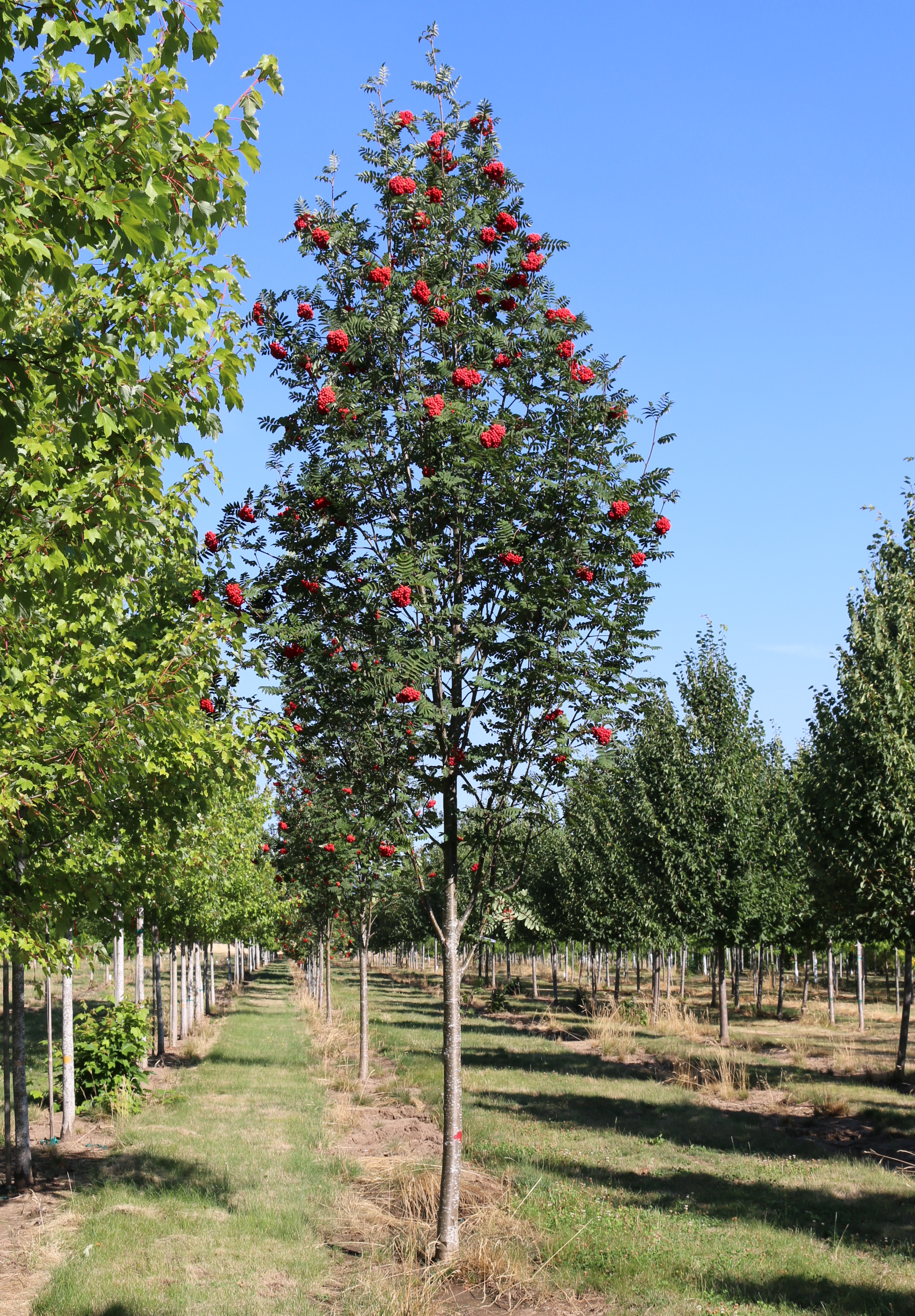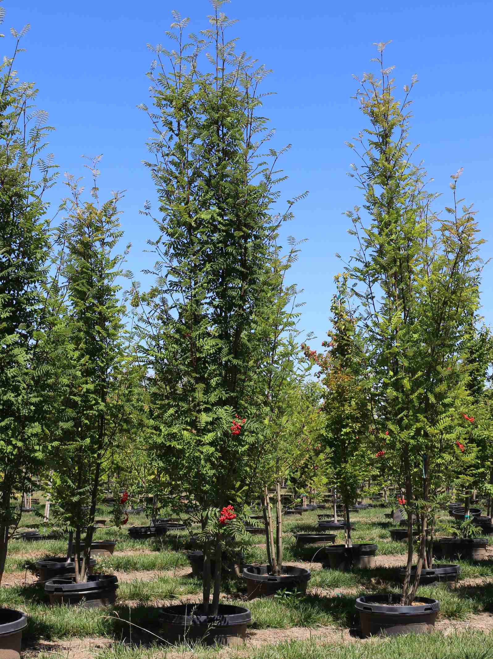 An upright, oval tree with dark green pinnately compound foliage. The white flowers are held on 5" diameter flat-topped corymbs. They are followed by clusters of red berries, which birds enjoy. The fall foliage color is bronze. Grown single trunk and multi-stem at our nursery. It prefers full sun to part shade, and average, well-drained soil. The species has naturalized in parts of North America.