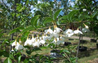 A small, rounded tree with a horizontal branching pattern. The bell-shaped spring flowers are white, pendulous and lightly fragrant. The fall color is yellow. It is suitable for planting under power lines. It prefers full sun to part shade in a moist, well-drained acidic soil. A lovely small tree for the garden, especially when sited where the flowers can be seen close up.