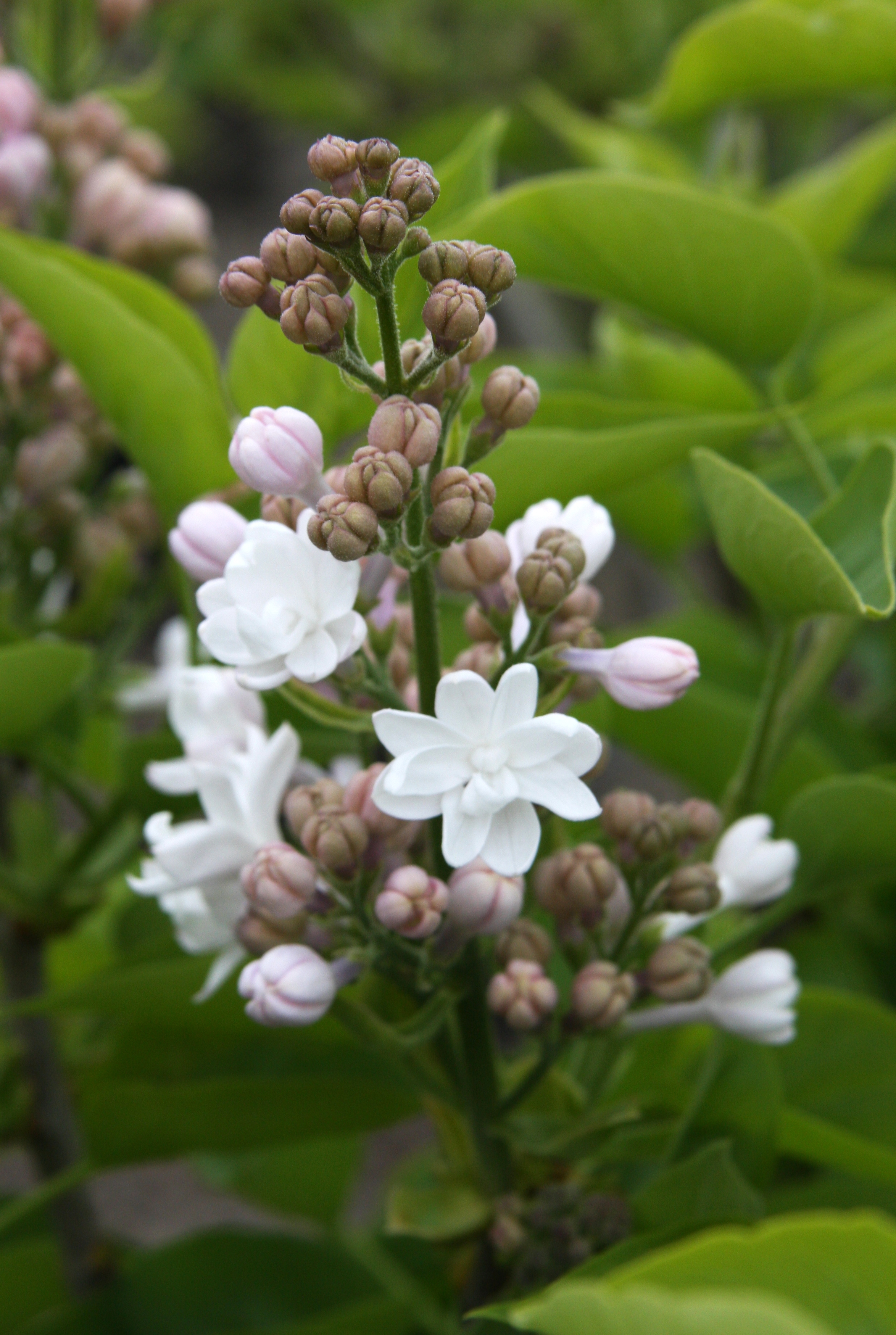 This is a large shrub also knows as Beauty of Moscow Lilac. The very fragrant, double flowers are blush pink in bud, opening to snowy white, giving the flowers a two-toned effect. Prune after flowering for form and to encourage next years blooms. It prefers full sun and a well-drained soil.