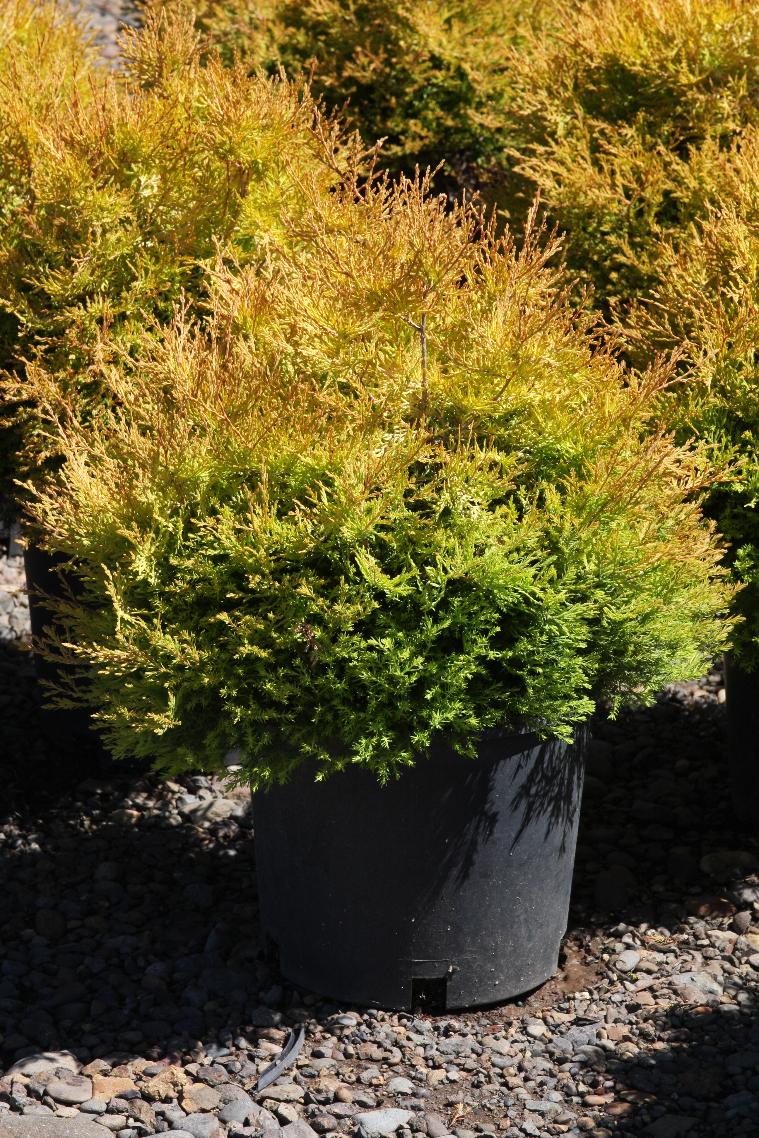 A slow growing, globe shaped shrub with rich, golden-yellow foliage. Color turns coppery in winter. It needs little to no pruning. Best in full sun but appreciate some light afternoon shade in hot summer areas. It performs best in a moist, well-drained soil, but is tolerant of other conditions except dry.
