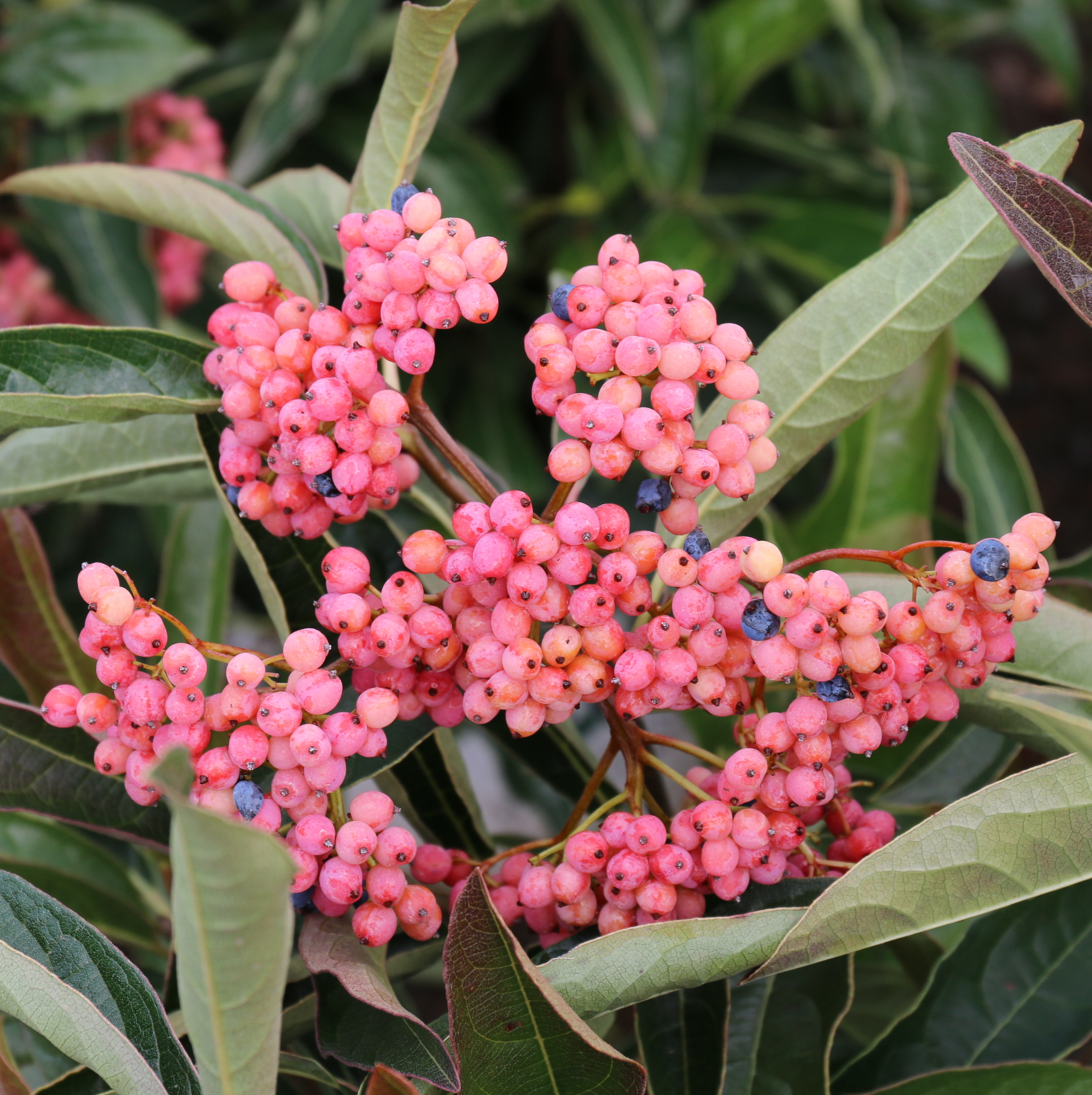 A compact, upright shrub with white flowers in the spring and glossy green leaves. The late summer berries go from green to bright pink and blue. Fall foliage is a dark maroon-red. It is a good pollinator for Viburnum nudum 'Winterthur', and will berry best if they are planted close together. It grows best in full sun to part shade in an average well-drained soil. Prune as needed in late fall or early spring. PP 12,870.