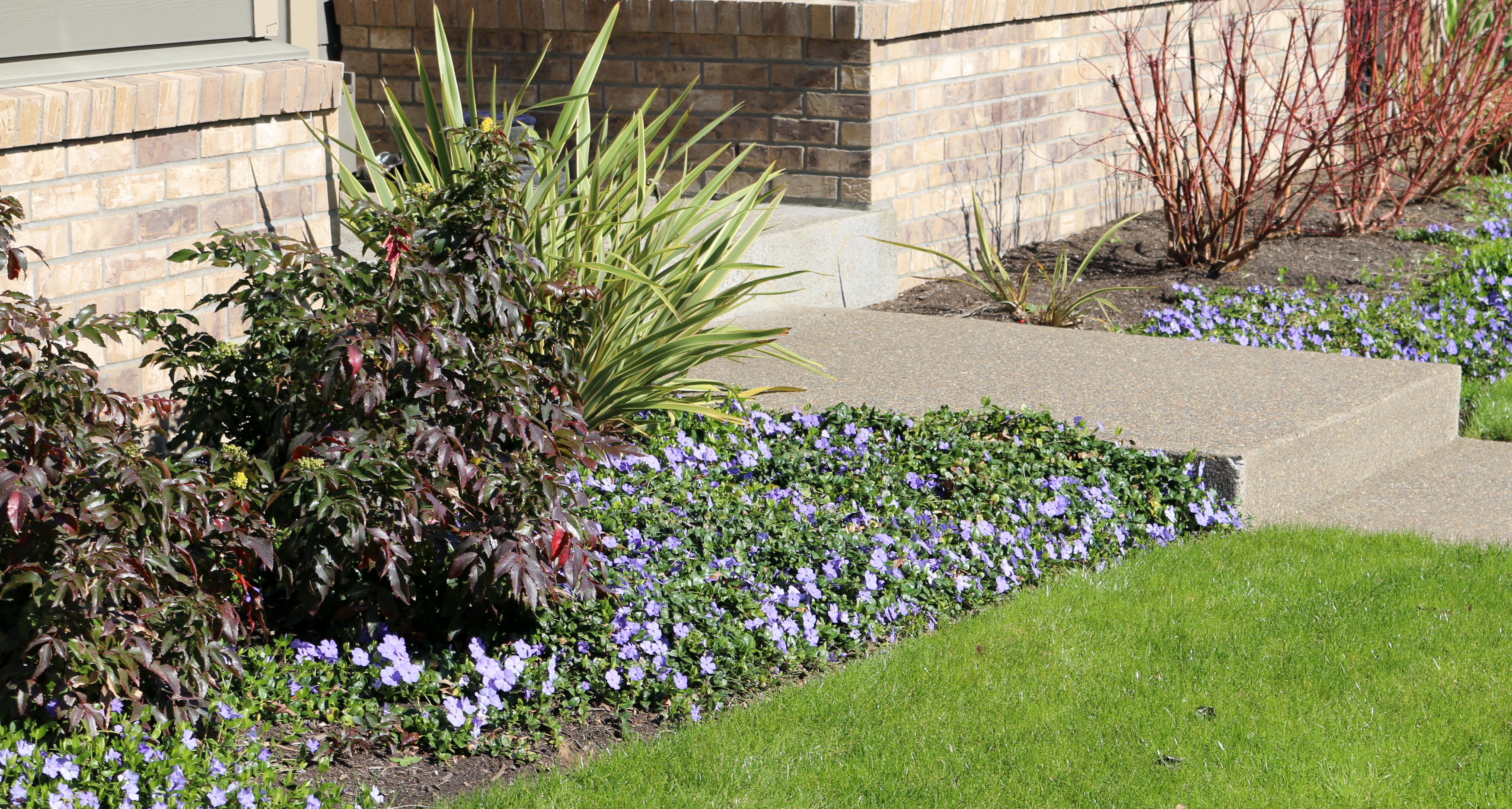 A fast growing, weed-smothering, spreading groundcover with dark green, glossy leaves. The spring flowers are intense blue-violet. It spreads outward from the crown rather than rooting along stems. Performs best with some shade and is tolerant of most soils. It does better with consistent summer moisture.