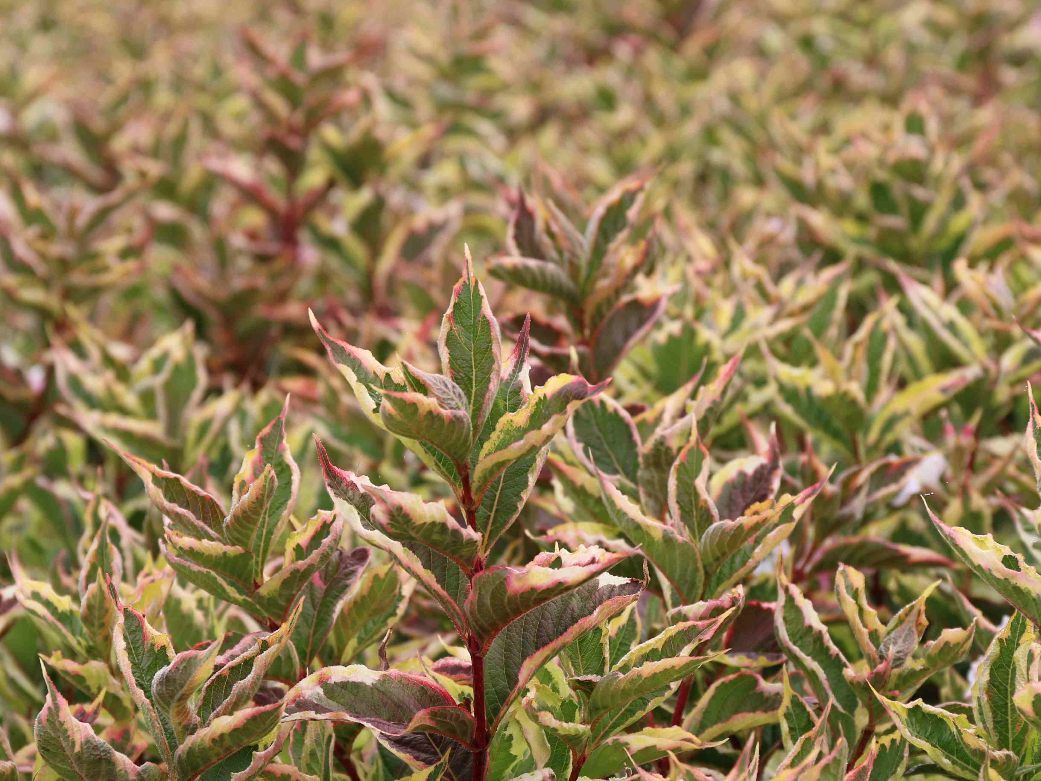 A rounded compact shrub with green and creamy-white variegated foliage. Blooms in the spring with trumpet-shaped flowers that are pink with pale pink-white centers. Attractive to hummingbirds and butterflies. It prefers full sun and an average, well-drained soil. Prune after flowering as needed.