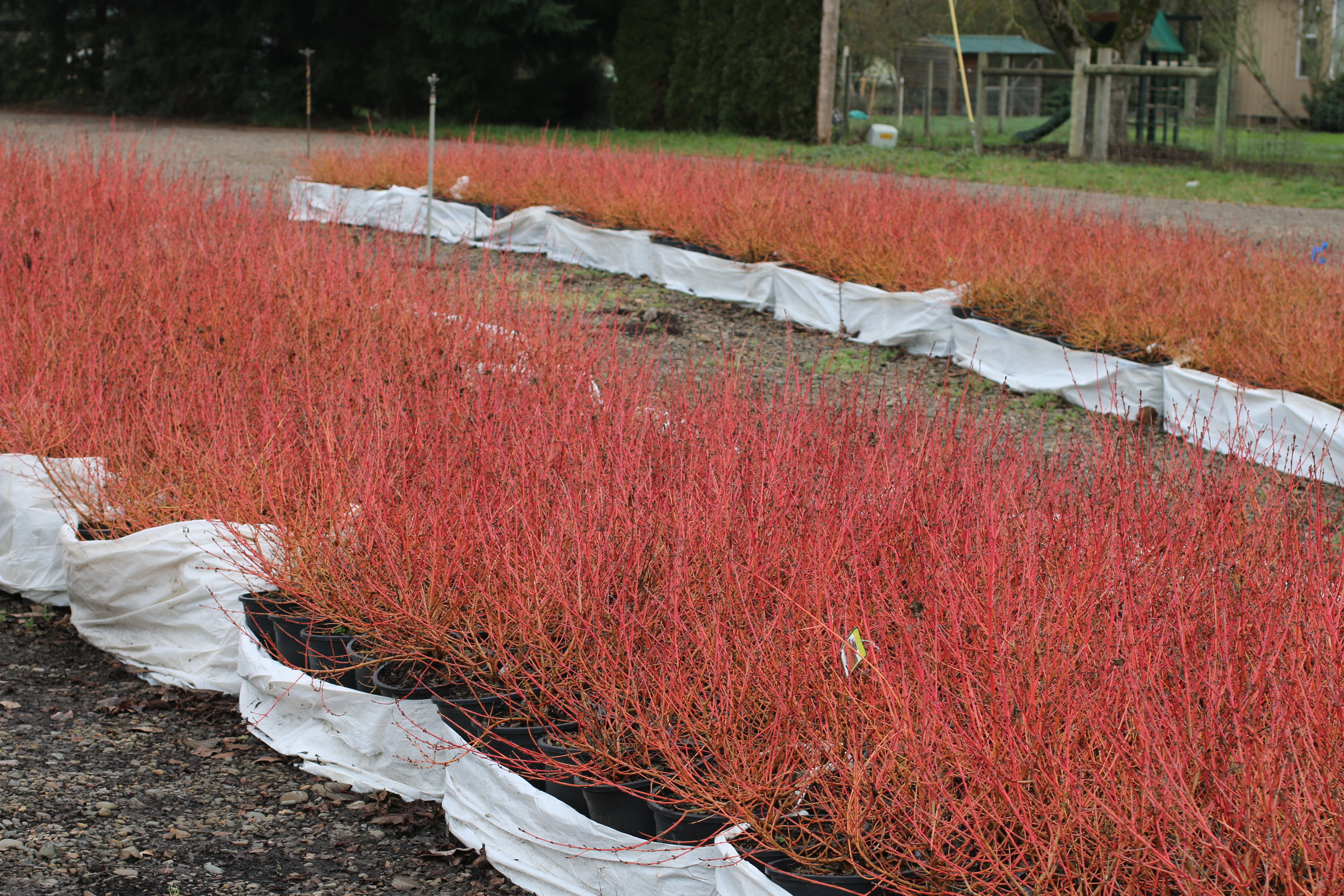 This week the Cornus sanguinea ‘Midwinter’ Fire in #5 containers glowed in the sun. The orangey-red tipped yellow stems would look great against an evergreen background, especially planted in a large group. Consider under planting them with early spring bulbs. Although tolerant of a wide range of soils, it will do best in consistently moist, well-drained soils. Prune as needed to promote fresh growth of the stems.
